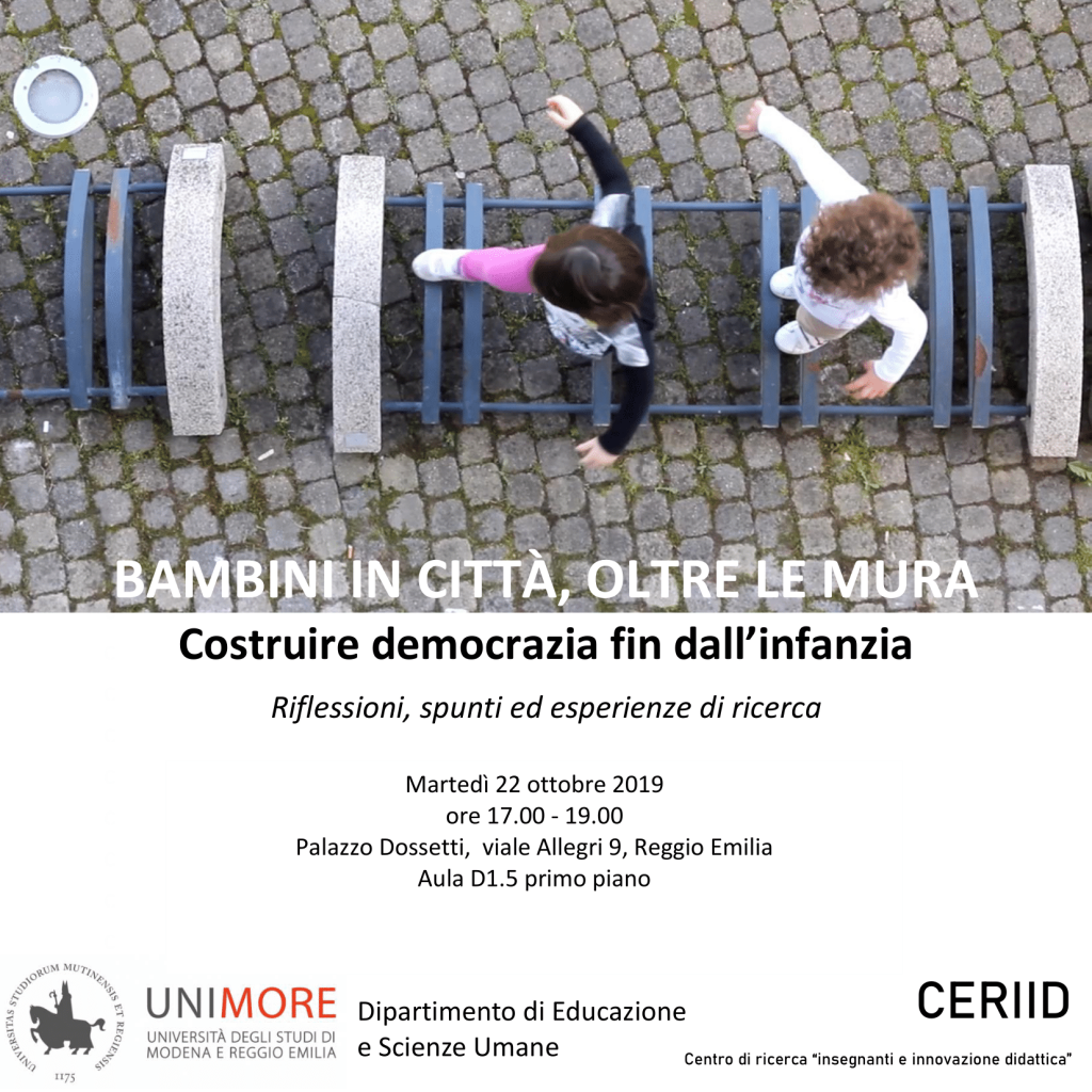 Questi alcuni dei temi affrontati in “Oltre le mura. L’infanzia e la scoperta degli spazi pubblici” , il recente testo curato dalla prof.ssaRoberta Cardarello e dal dott. Andrea Pintus del dipartimento di Educazione e Scienze Umane (DESU) di Unimore, (ed. Junior 2019) che saranno ripresi dagli autori in una giornata di riflessioni, spunti ed esperienze di ricerca martedì 22 ottobre, alle ore 17.00 nell’Aula D1.5 del complesso universitario Palazzo G. Dossetti (Viale A. Allegri 9) a Reggio Emilia.