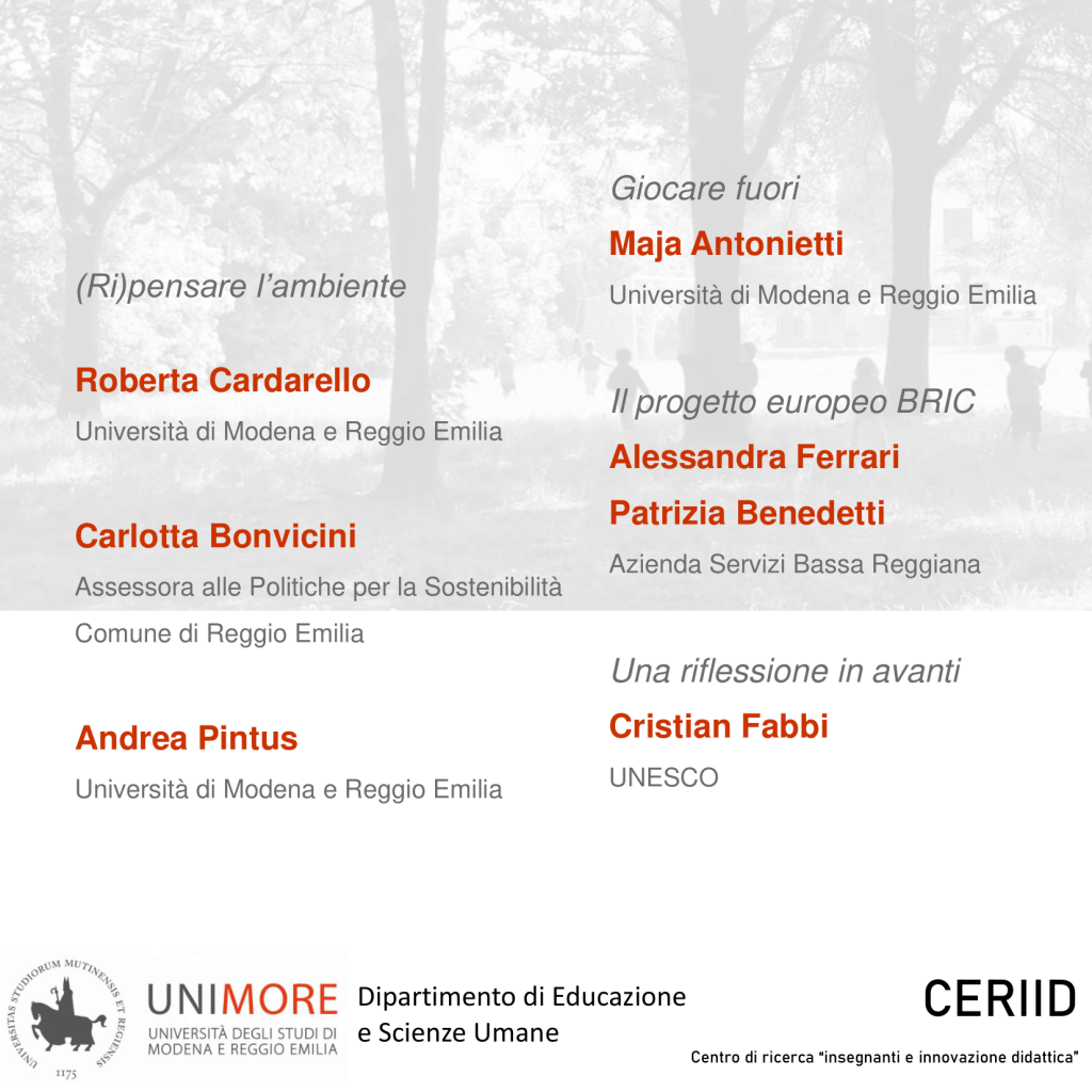 Contribuiranno alla riflessione, portando spunti e contributi di ricerca, Carlotta Bonvicini, Assessora alle Politiche per la Sostenibilità del Comune di Reggio Emilia, Maja Antonietti, ricercatrice del CERIID (Centro di ricerca “insegnanti e innovazione didattica”) di Unimore,Alessandra Ferrari e Patrizia Benedetti, pedagogiste dell’Azienda Servizi Bassa Reggiana coinvolte nel progetto europeo BRIC (Childhood, Public Spcaces and Demogracy), Cristian Fabbi, International Senior Expert presso l’UNESCO e Presidente dell’Istituzione Nidi e Scuole dell’Infanzia del Comune di Reggio Emilia.