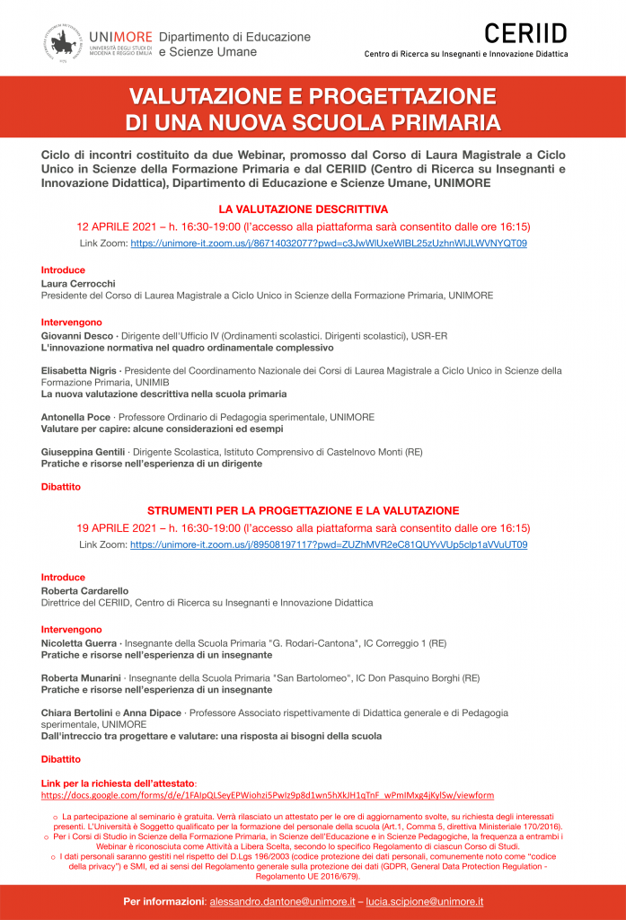 Il Webinar del 12 Aprile 2021 (dalle ore 16:30 alle ore 19:00), La Valutazione Descrittiva, ha previsto l’introduzione di Laura Cerrocchi (Presidente CLMCU in Scienze della Formazione Primaria, UNIMORE); gli interventi di Giovanni Desco (Dirigente dell’Ufficio IV – Ordinamenti scolastici. Dirigenti scolastici – USR-ER), L’innovazione normativa nel quadro ordinamentale complessivo, Elisabetta Nigris (Presidente del Coordinamento Nazionale dei CLMCU in Scienze della Formazione Primaria, UNIMIB), La nuova valutazione descrittiva nella scuola primaria, Antonella Poce (Professore Ordinario di Pedagogia sperimentale, UNIMORE), Valutare per capire: alcune considerazioni ed esempi, Giuseppina Gentili (Dirigente Scolastica, Istituto Comprensivo di Castelnovo Monti – RE), Pratiche e risorse nell’esperienza di un dirigente; il dibattito finale.